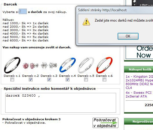 Přinášíme další doplněk pro shop ZenCart a to možnost zvolit při nákupu dárek. Zákaznika určitě chcete přilákat k nákupu a ještě nabídnout nějaký ten dárek. Doplněk do Zencart shopu slouží k výběru až ze šesti dárků. Zákazník na základě velikosti nákupu (cena objednávky) má možnost si vybrat dárek ke svému nákupu. Zákazník si vybere zboží a vloží do nákupního košíku. Systém provede zákazníka až do potvrzení objednávky a v jednom z kroků je nabídnuta možnost vybrat si dárek. Po zvolení dárku může zákazník dokončit objednávku. Obsah o zvolení dárku je přenášen v poznámce a v administraci tyto informace najdete v přehledu u objednávky. Ilustrační obrázek znázorňuje jak by mohl výběr dárku vypadat.
